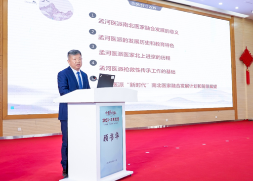 常州孟河医派传承学会会长顾书华在会上发言 当日,北京市中医管理局局长、北京中医药学会会长屠志涛,国医大师、中国工程院院士王琦、国家中医药博物馆馆长杨荣臣,北京市中医管理局副局长李德娟,首都医科大学附属北京中医医院党委副书记、院长刘清泉,江苏省中医药管理局综合处处长石健峰、中华中医药学会副秘书长、首都医科大学中医药学院院长王伽伯、中华中医药学会副秘书长马骏,北京中医药大学国医大师颜正华先生传人代表张冰,中日友好医院中医大内科主任史载祥,北京市通州区委卫生健康工作委员会委员王峰,常州孟河医派传承学会会长顾书华共12人在论坛上共同参加了孟河医派“新时代”南北医家融合发展工程启动仪式,随后顾书华会长在学术流派“源与流”大会议程环节作了《孟河医派“新时代”南北医家融合发展计划》的报告,介绍了该发展工程计划。 本次大会隆重启动孟河医派“新时代”南北医家融合发展工程,打造中医流派赓续传承新范式,下一步将建立南北医家工作机制、挖掘整理孟河医派南北学术经验和文化特色,共同推动孟河医派南北医家融合发展。